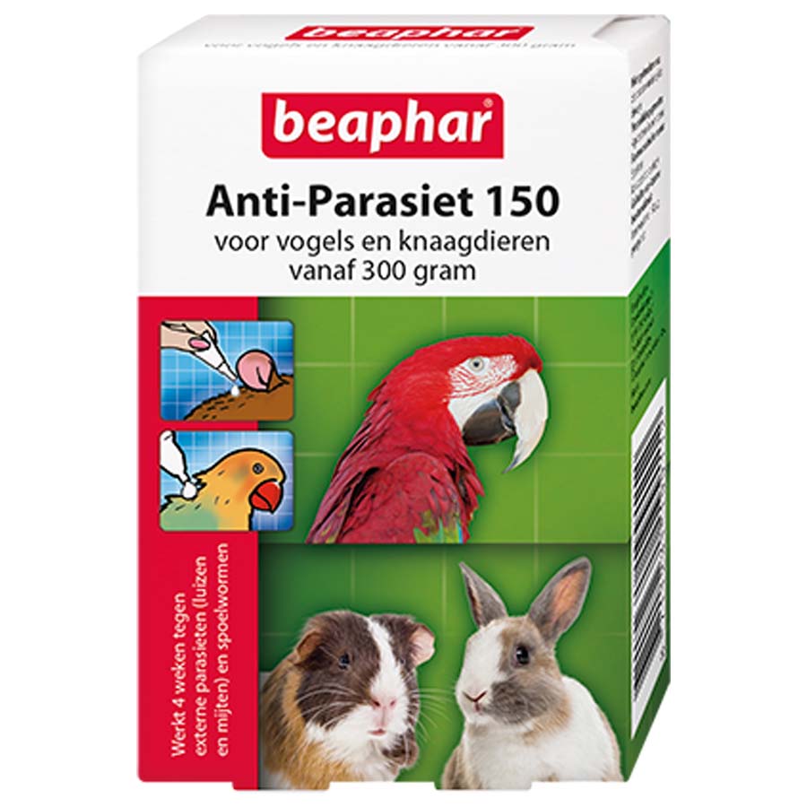 Beaphar Anti-Parasiet 150, spot-on voor vogels en knaagdieren vanaf 300 g, 150ug ivermectine per pipet. Diergeneesmiddel vrij van registratie, voor de behandeling van externe parasieten (luizen en mijten) en/of van darminfecties met spoelwormen bij knaagdieren zoals (cavia’s, ratten en chinchilla’s), konijnen, fretten en vogels van 300-750g (zoals papegaaien en duiven).
